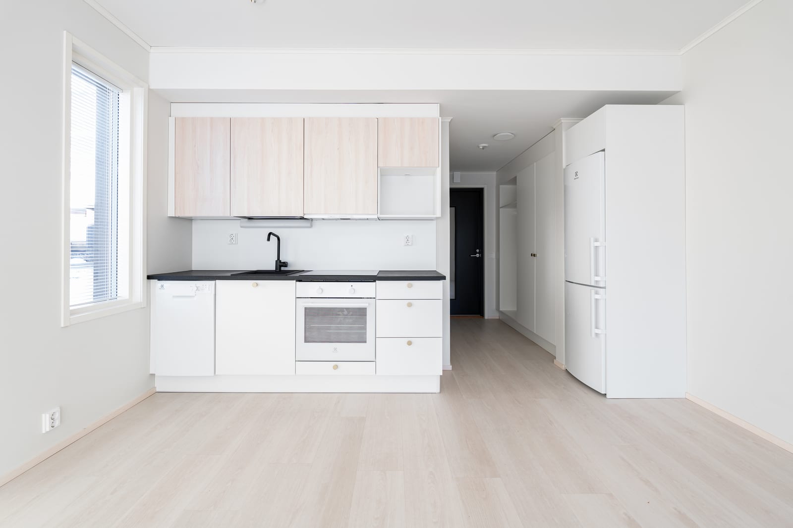 Vaalea avokeittiö integroimattomilla kodinkoneilla. Asunnossa on astianpesukone ja induktioliesi